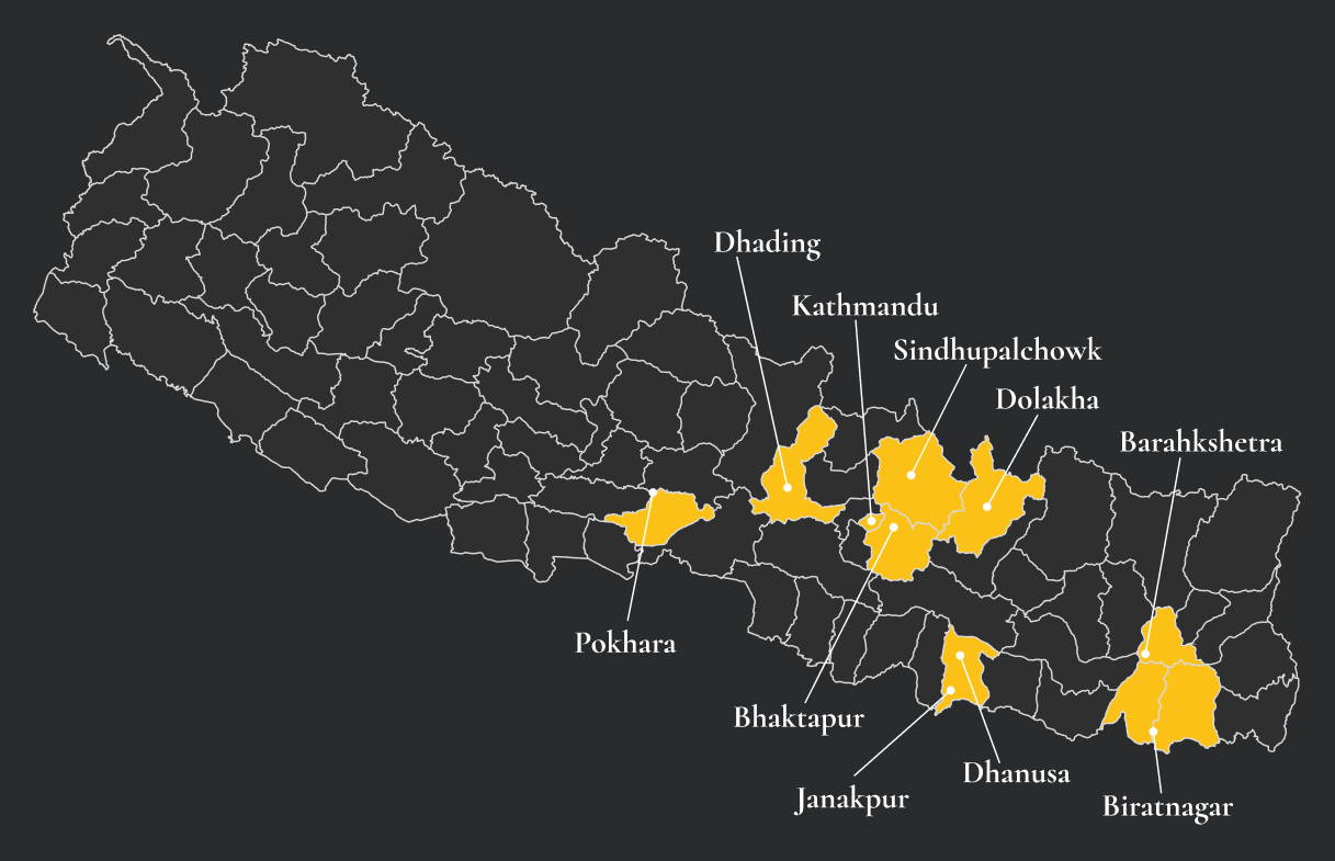 Sindhupalchok Dolakha Kathmandu Pokhara Biratnagar Bhaktapur Dhading Dhanusha Koshi Janakpur